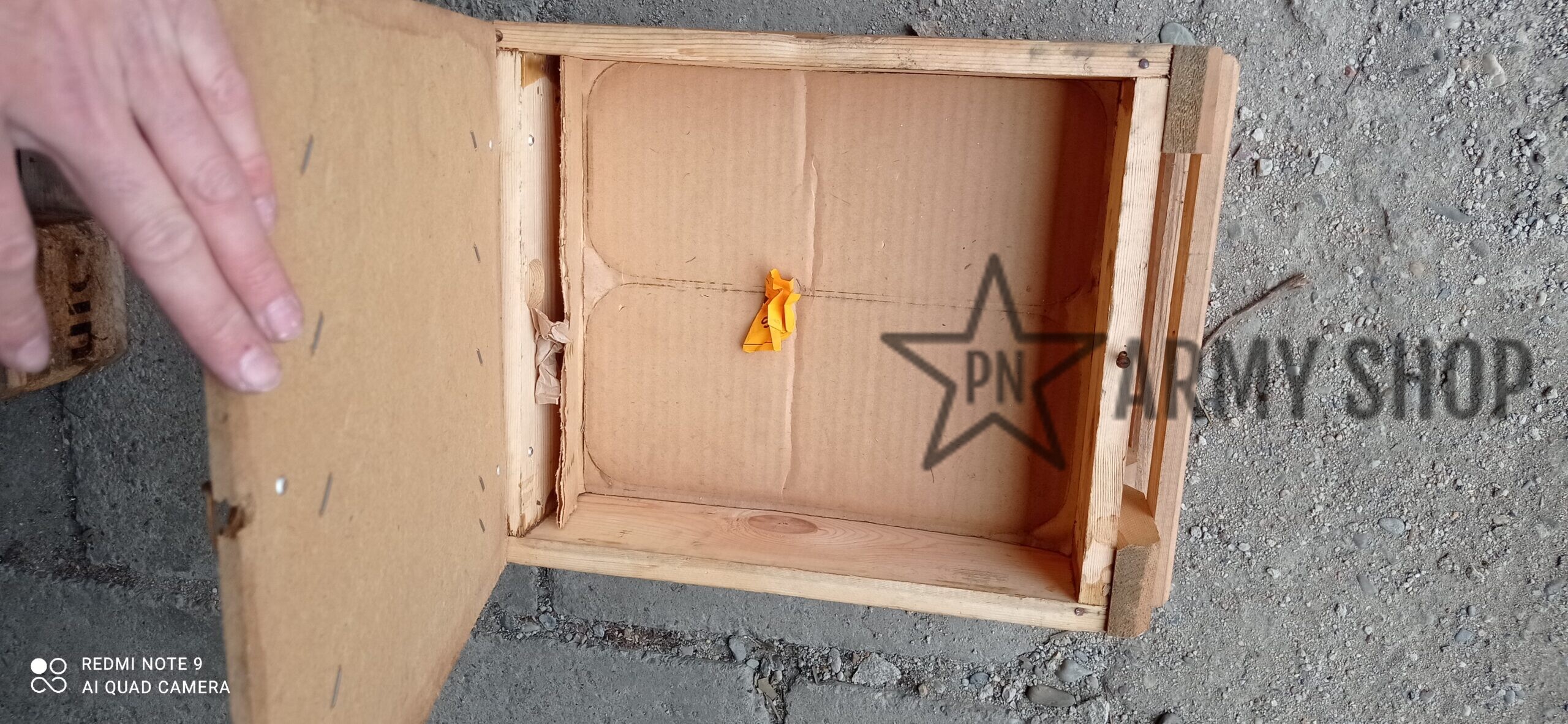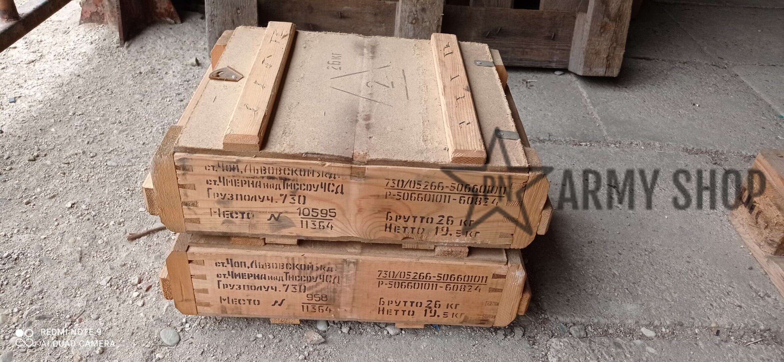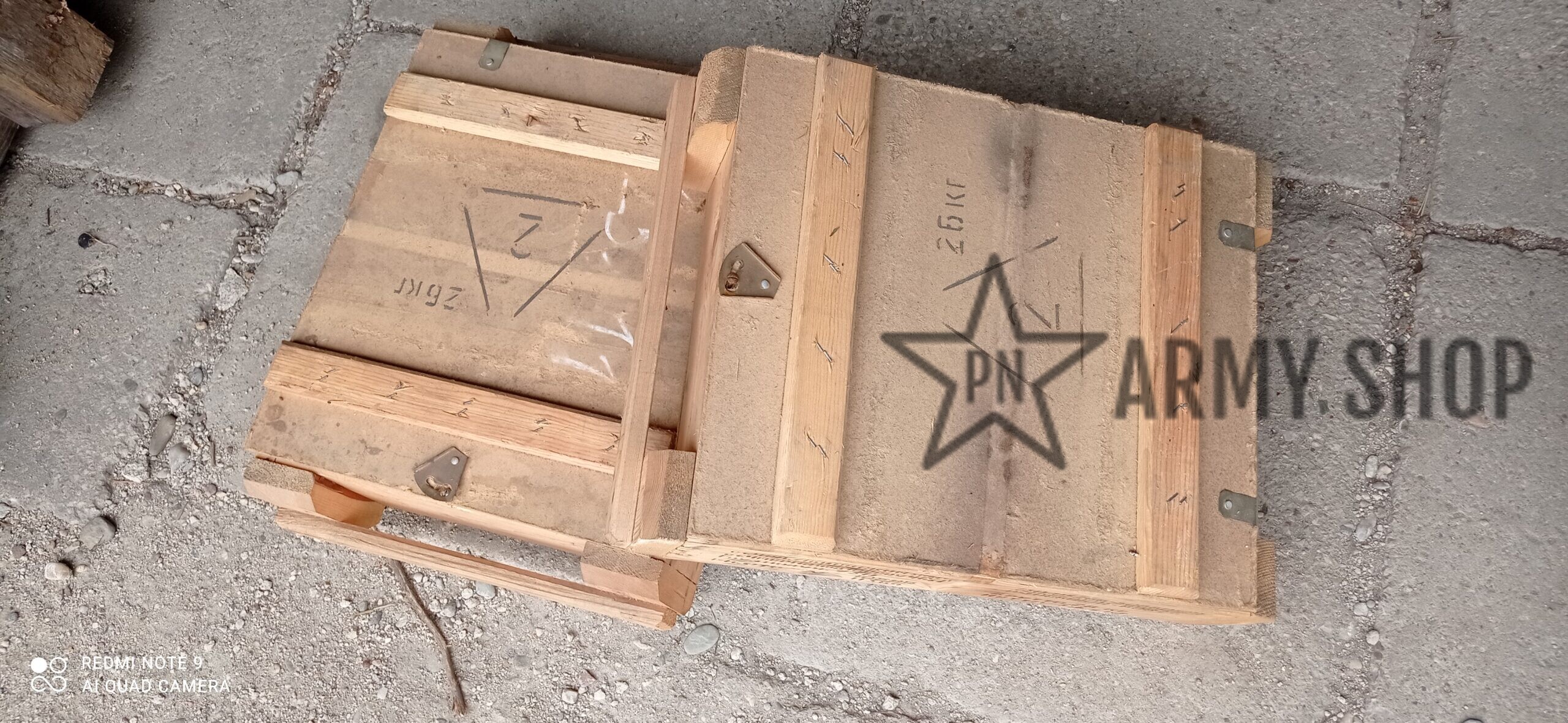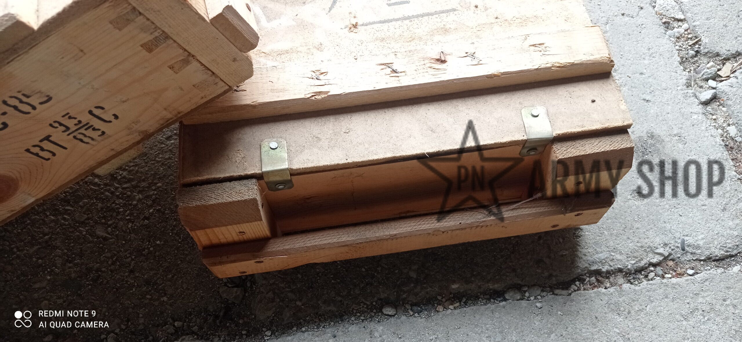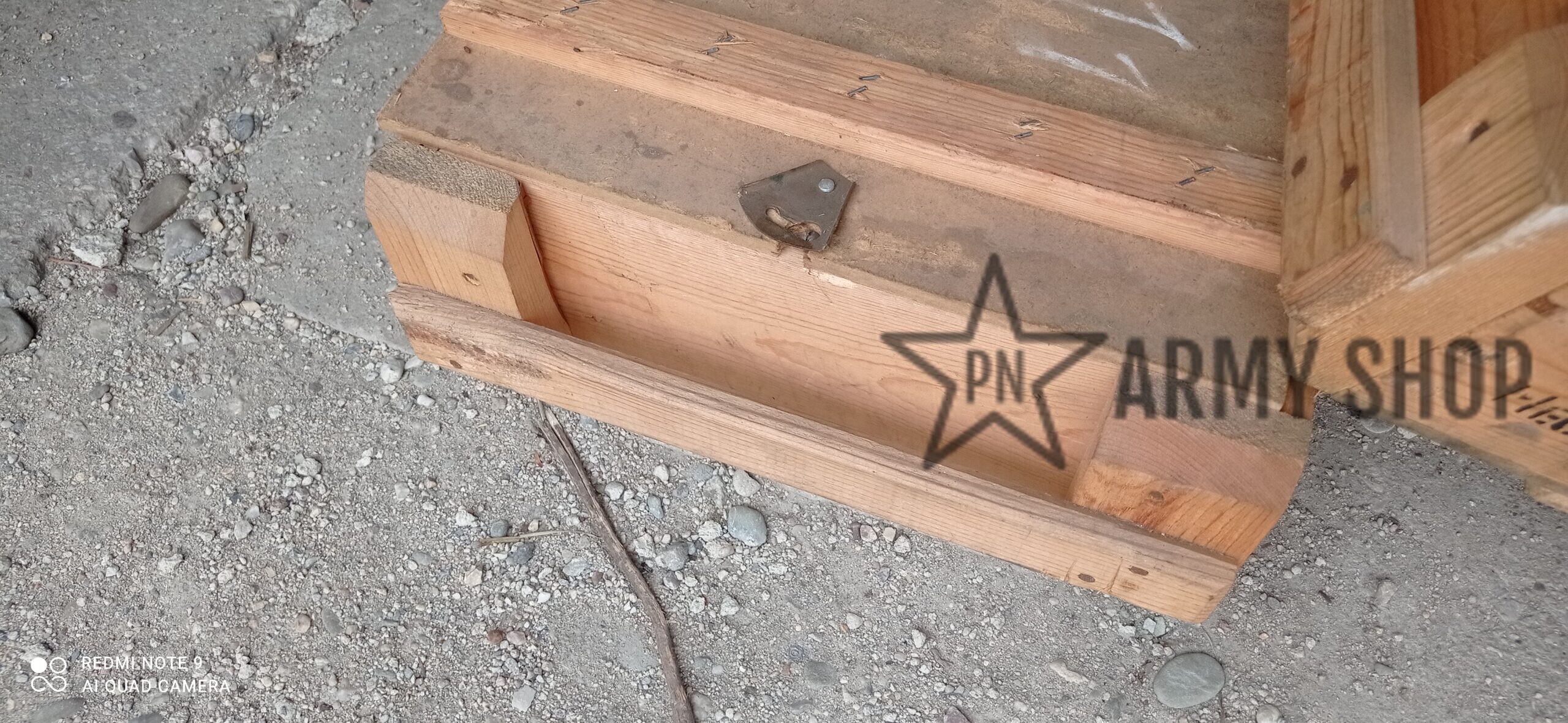 Dřevěná schránka – bedna od munice, bedny byly používány jen na původní účel uschování munice, prodáváno jako použitý vyřazený armádní materiál, šablonace se může lišit, cena za kus
