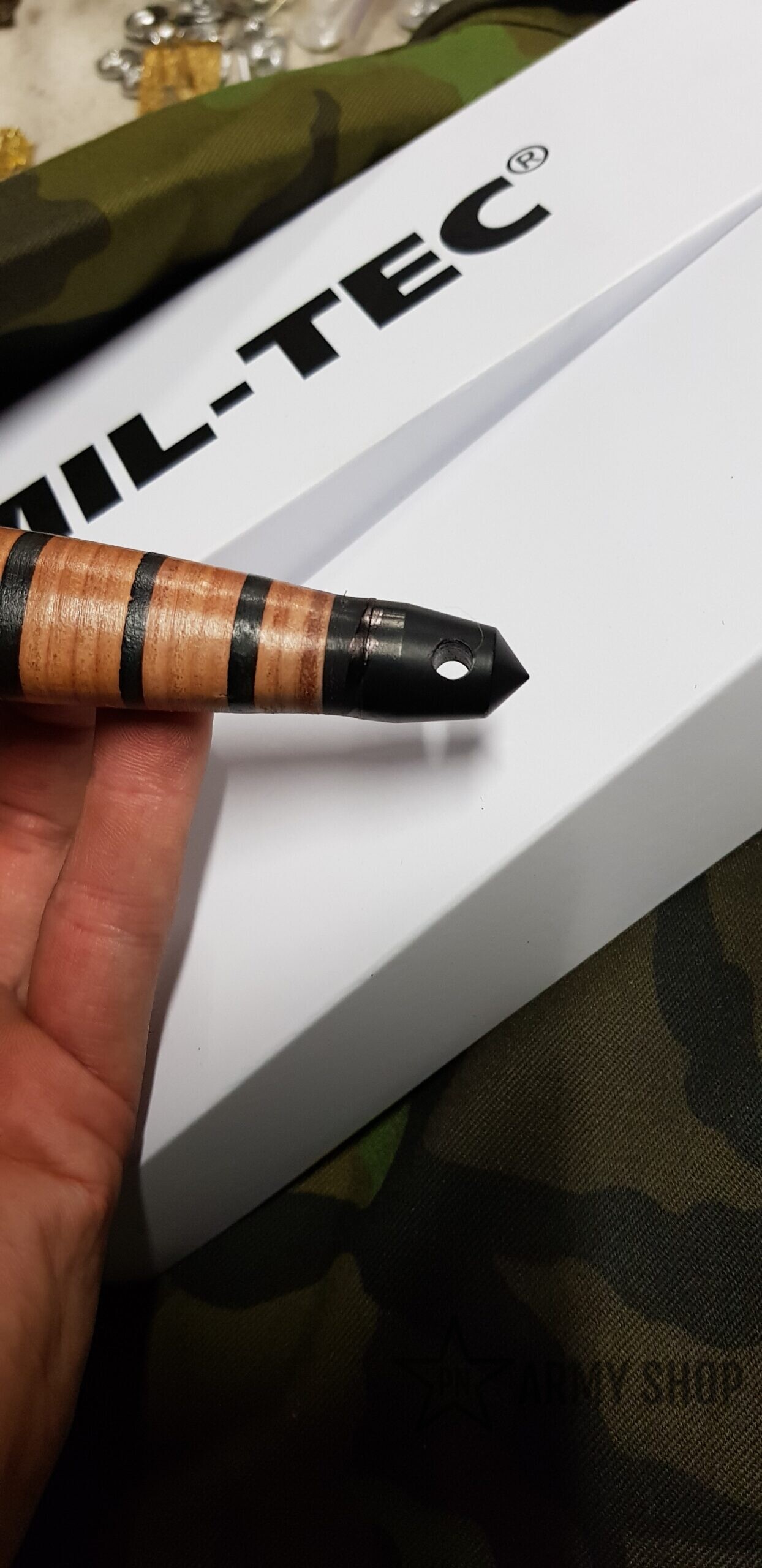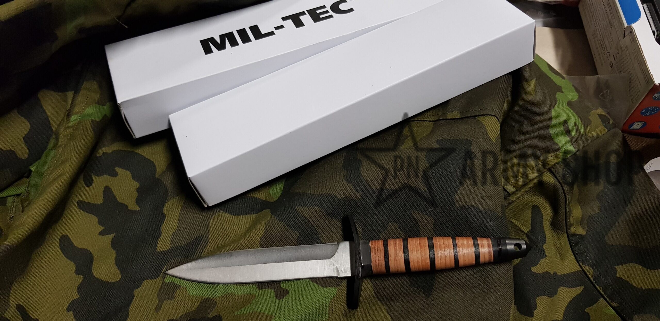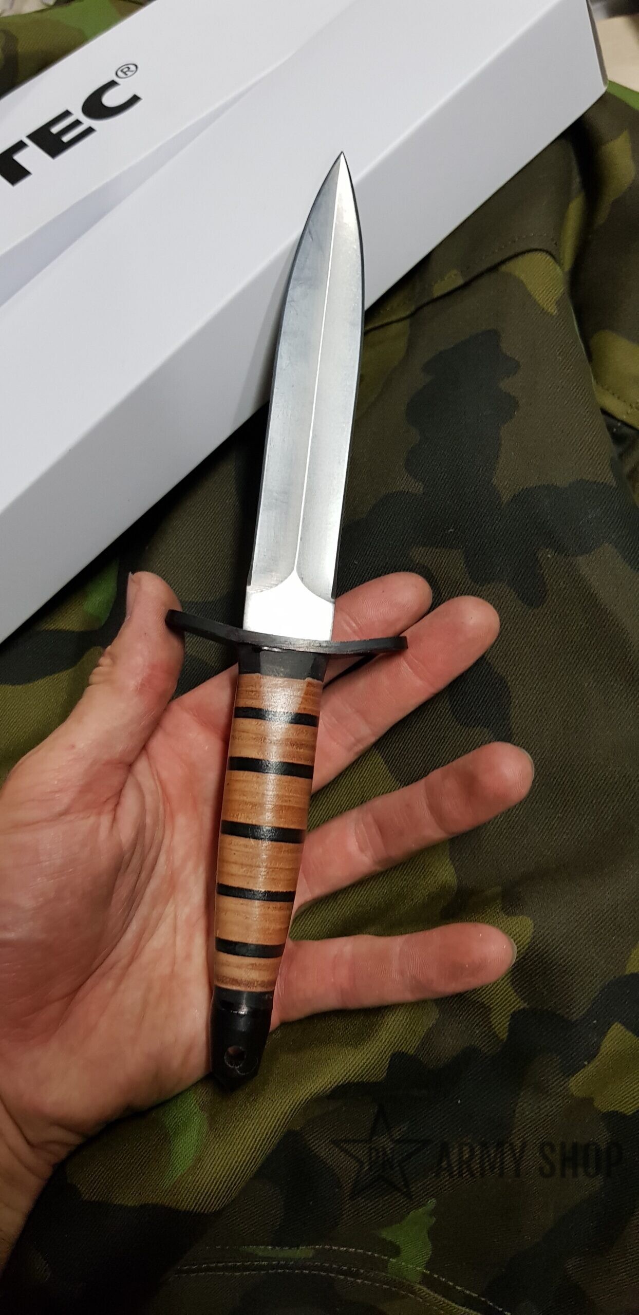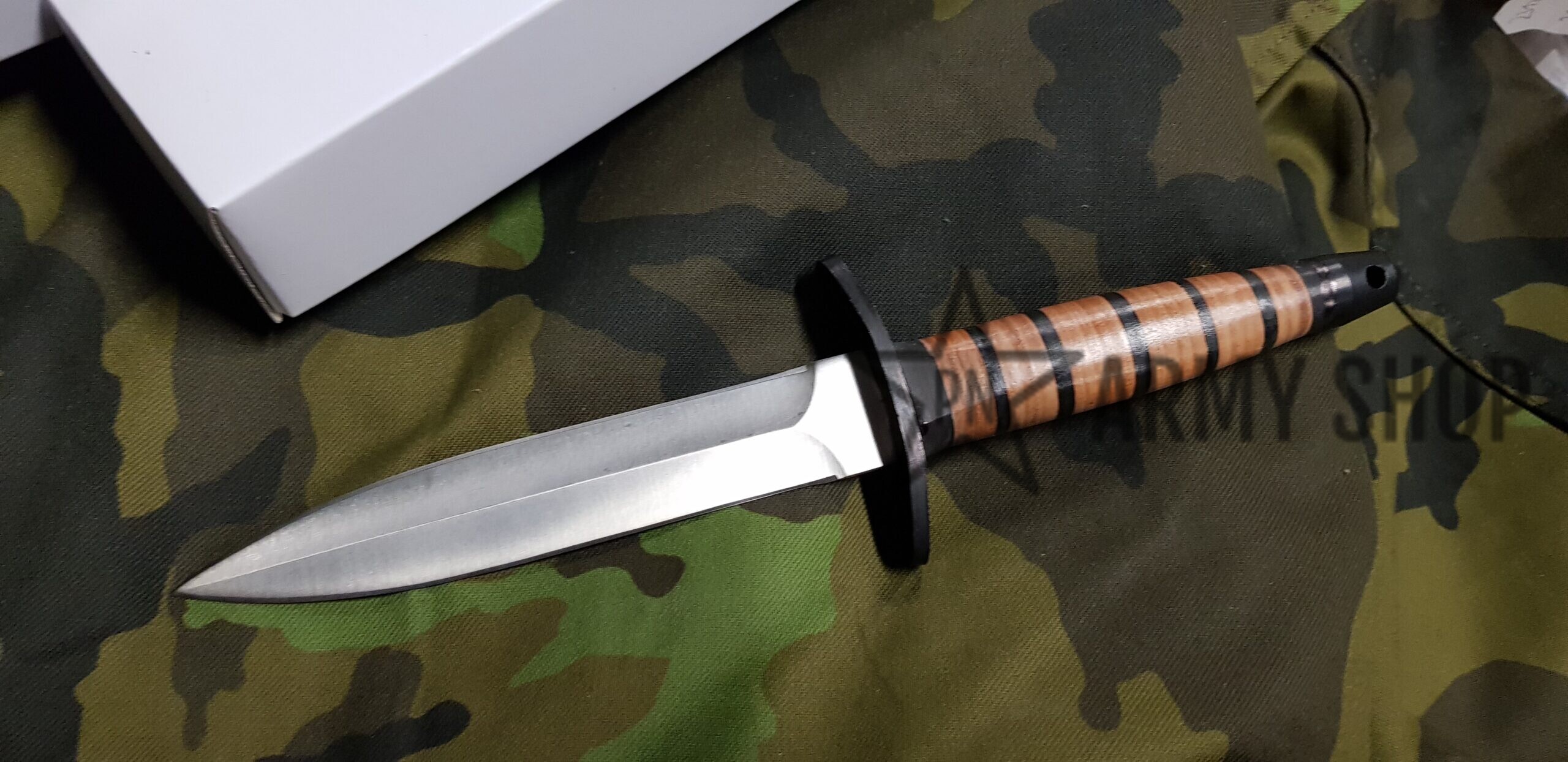 dýka – oboustranně broušená čepel s hladkým ostřím disponuje saténovou povrchovou úpravou, ocelovou záštitou a rukojetí vyrobenou z lisované kůže. Na konci rukojeti naleznete otvor na provlečení pojistné šňůry a výstupek použitelný pro nouzové rozbíjení skla.