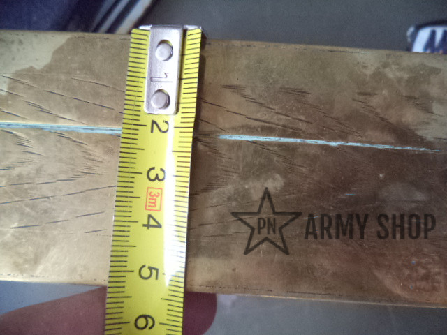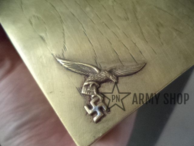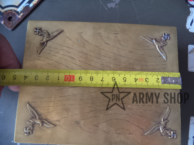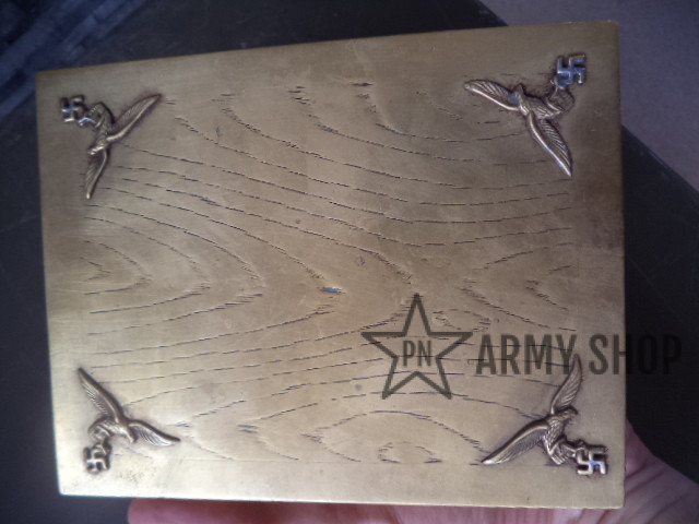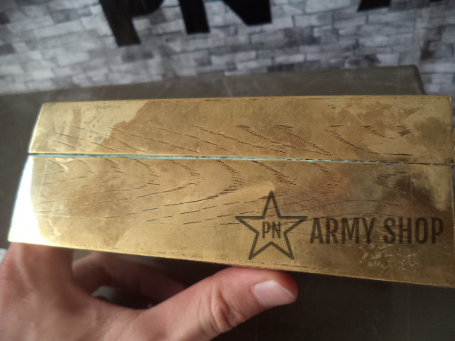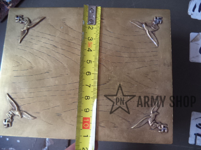 kazeta – materiál nejspíš mosaz, uvnitř dřevěná, po německém důstojnikovi na osobní věci, rozměry šířka 145mm, výška 52mm a hloubka 113mm, ruční práce, zdobená, konkrétní kus