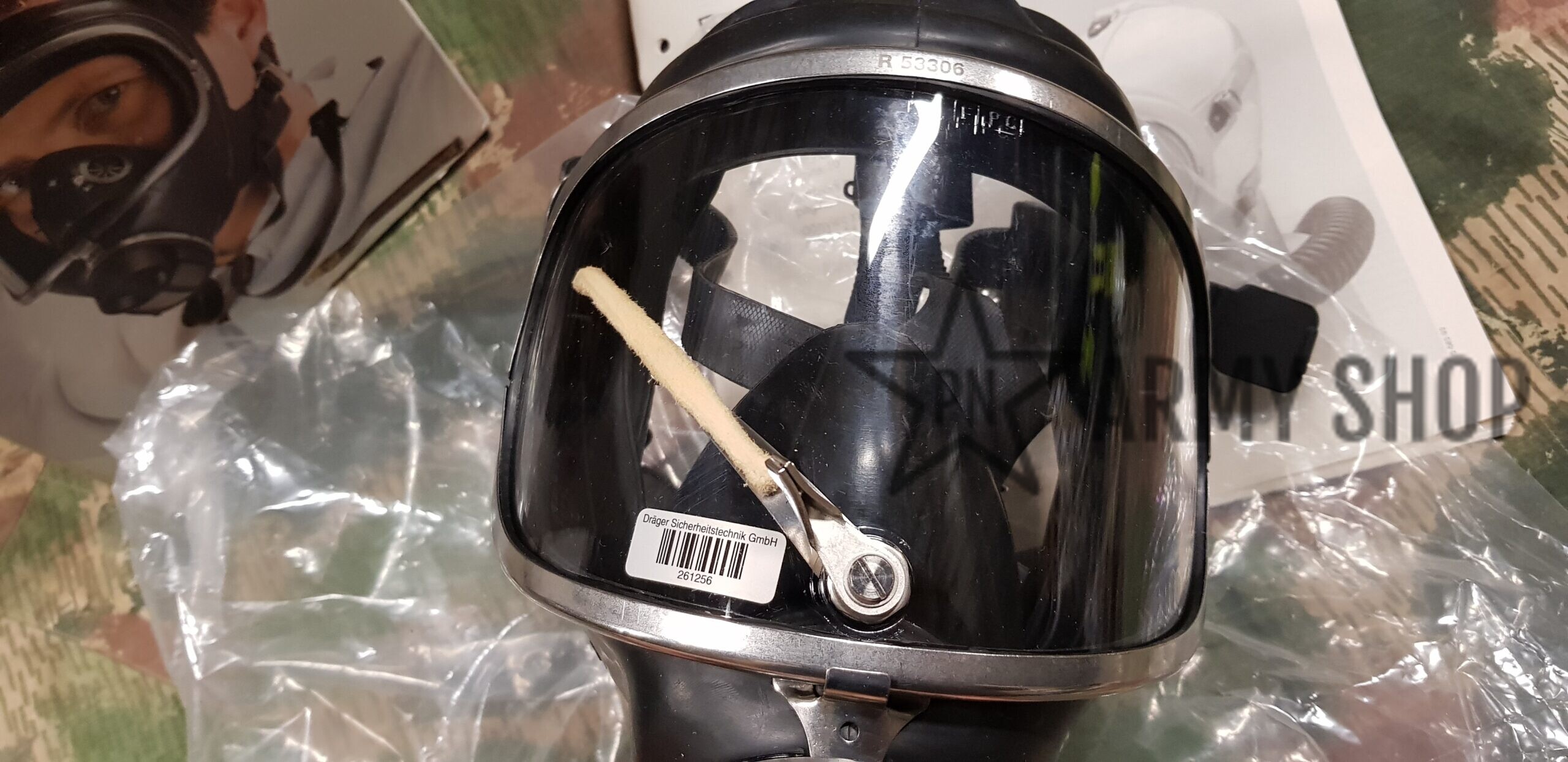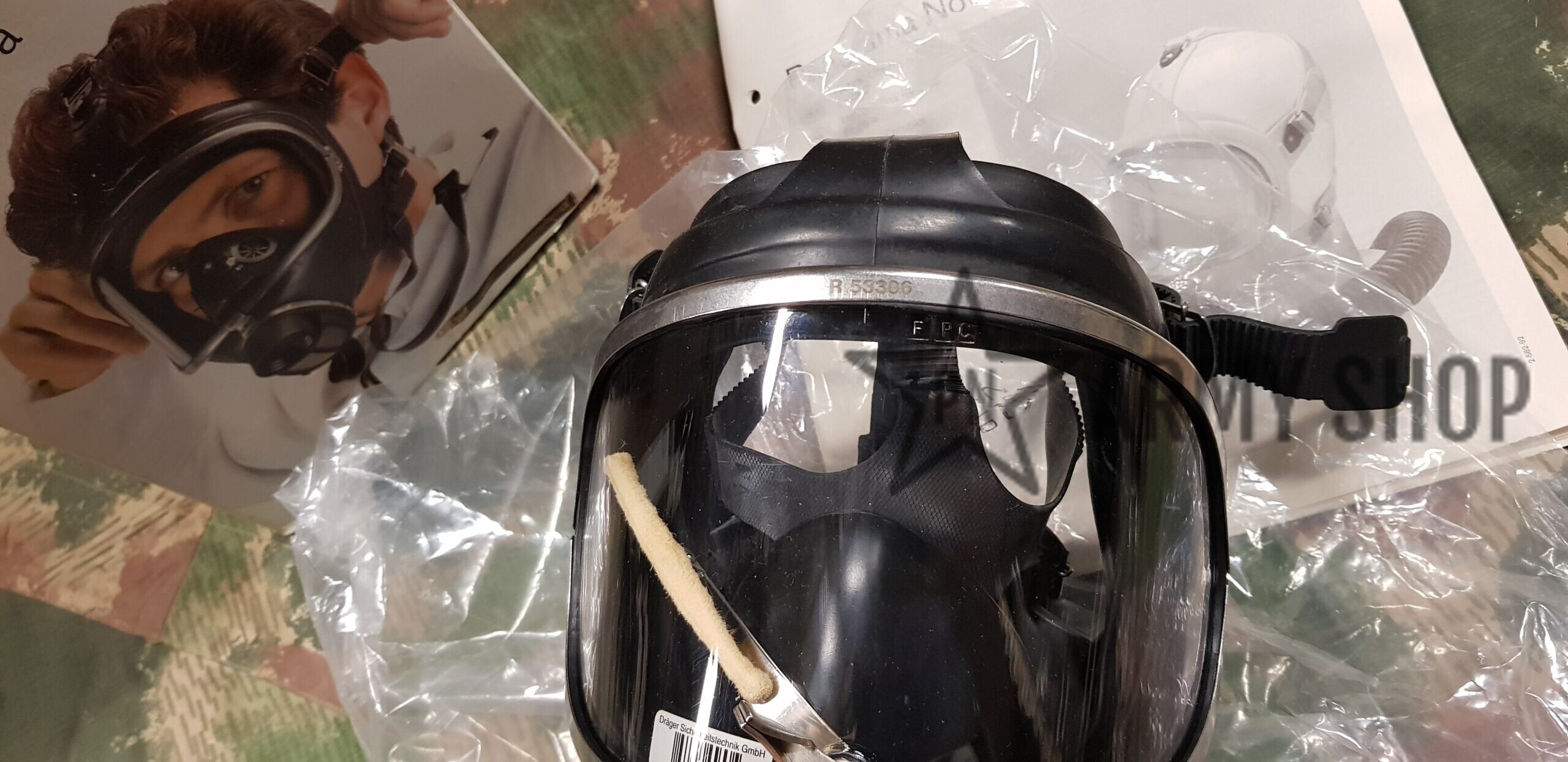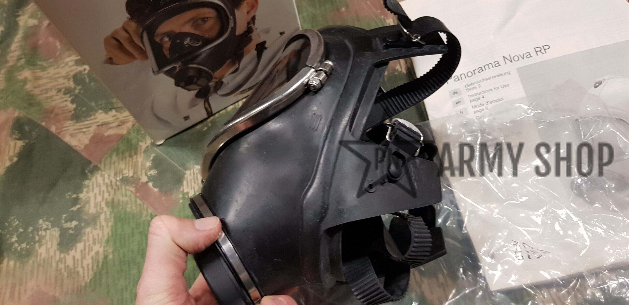 maska PANORAMA NOVA se stěračem, dobře padne díky dvojitému těsnícímu rámu, široké zorné pole, 180° panoramatický polykarbonátový zorník, upevněný v rámu z nerezové oceli, polykarbonátový štít odolný proti nárazům a teplu, ochrana proti zamlžování díky optimální ventilaci přes nádechový a výdechový ventil, pohodlné nošení díky pryžové směsi šetrné k pokožce (EPDM), praktický popruh na krk pro nošení masky před a po použití, JEDNÁ SE O VYŘAZENÉ ARMÁDNÍ ZÁSOBY NĚMECKÉ ARMÁDY – HASIČSKÉ JEDNOTKY, ZBOŽÍ JE POUŽITÉ, PRODÁVÁNO JAKO DEKORACE NEBO KE SBĚRATELSKÝM ÚČELŮM BEZ JAKÉKOLIV ZÁRUKY