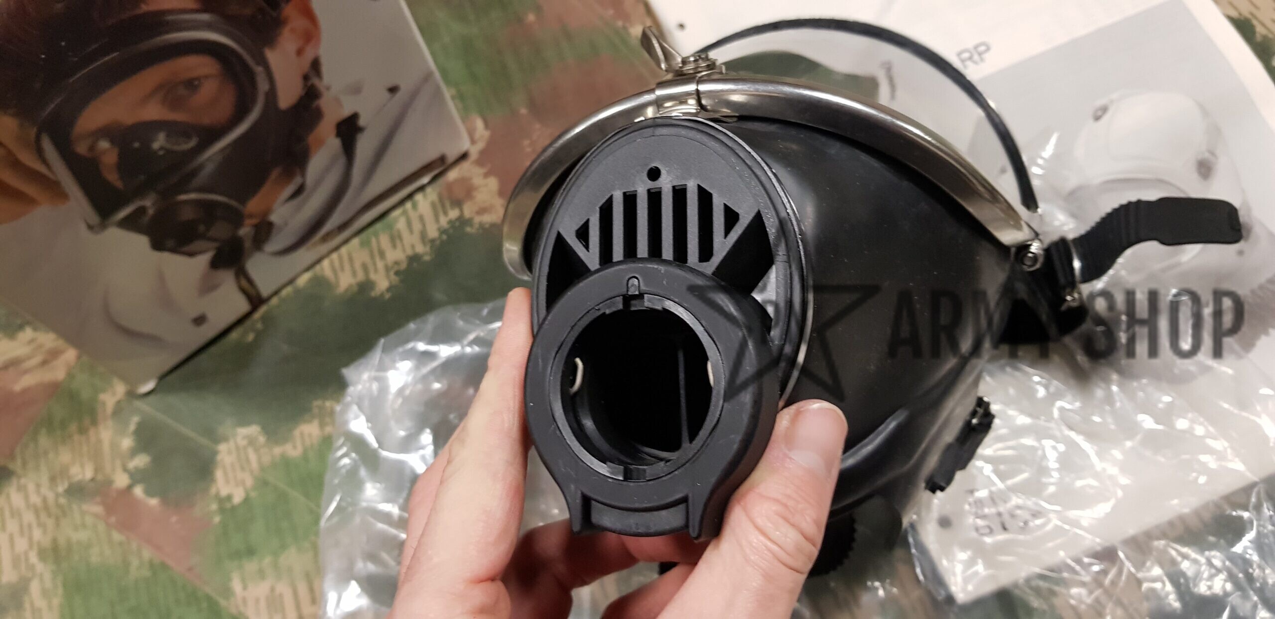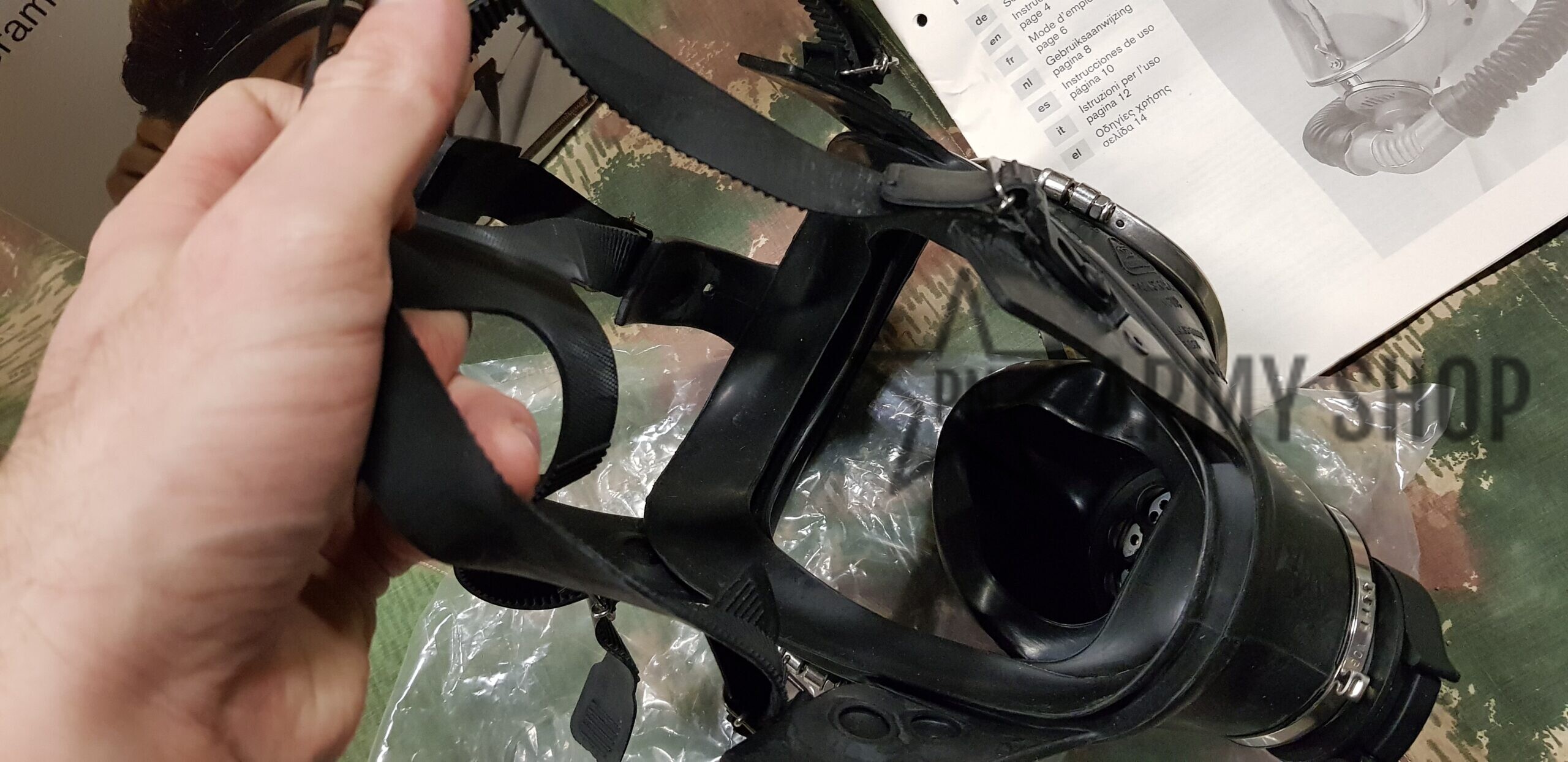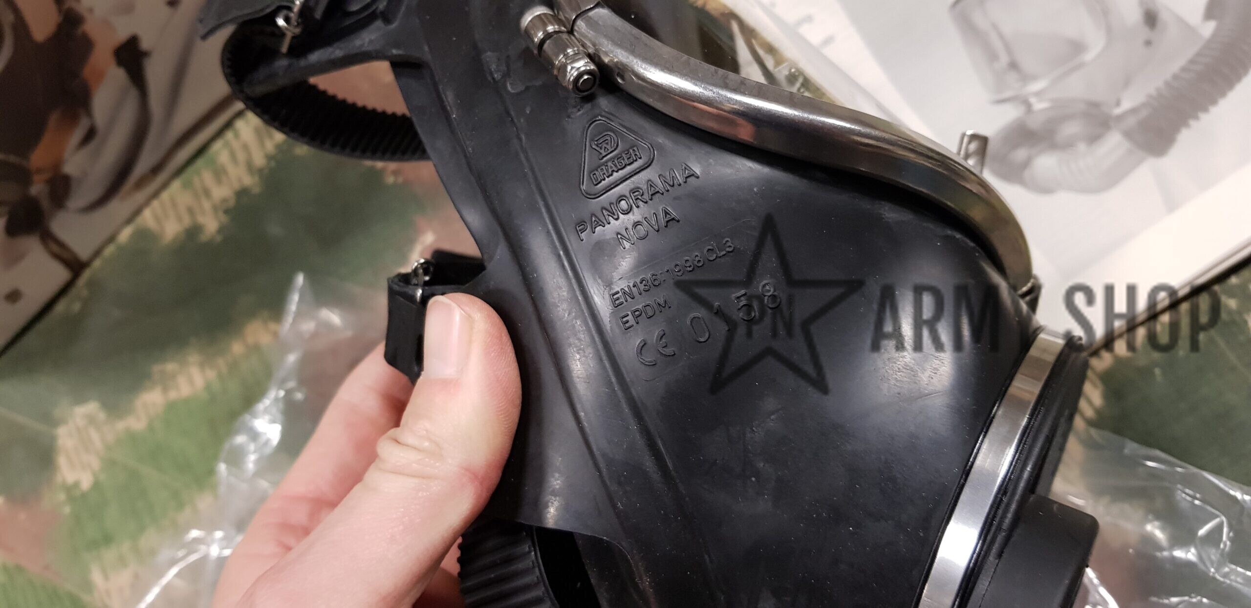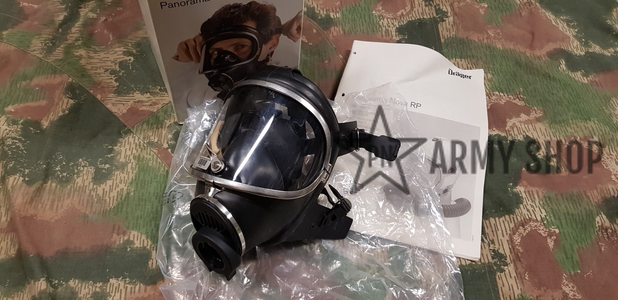 maska PANORAMA NOVA se stěračem, dobře padne díky dvojitému těsnícímu rámu, široké zorné pole, 180° panoramatický polykarbonátový zorník, upevněný v rámu z nerezové oceli, polykarbonátový štít odolný proti nárazům a teplu, ochrana proti zamlžování díky optimální ventilaci přes nádechový a výdechový ventil, pohodlné nošení díky pryžové směsi šetrné k pokožce (EPDM), praktický popruh na krk pro nošení masky před a po použití, JEDNÁ SE O VYŘAZENÉ ARMÁDNÍ ZÁSOBY NĚMECKÉ ARMÁDY – HASIČSKÉ JEDNOTKY, ZBOŽÍ JE POUŽITÉ, PRODÁVÁNO JAKO DEKORACE NEBO KE SBĚRATELSKÝM ÚČELŮM BEZ JAKÉKOLIV ZÁRUKY