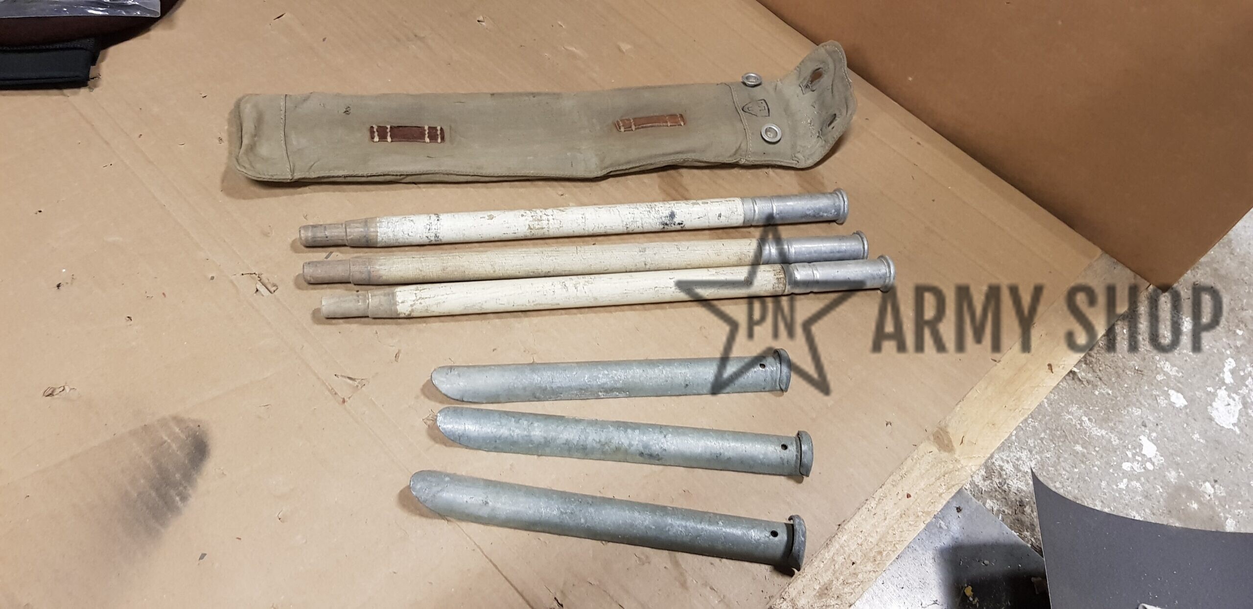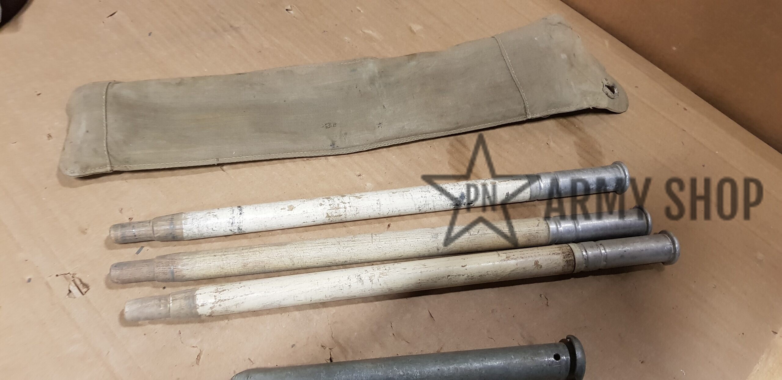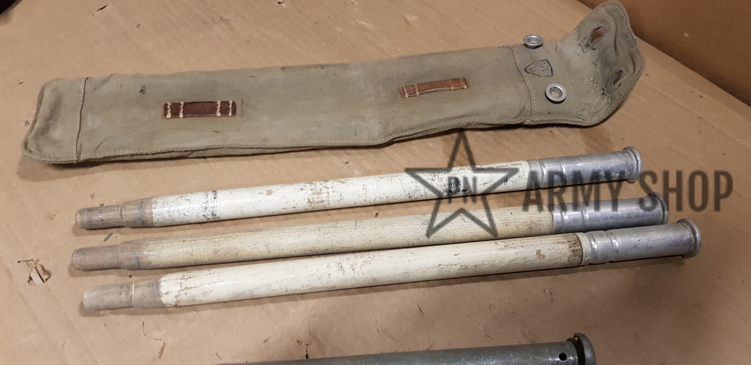 sada kolíků a tyčí ke stanové celtě v pouzdru, původně německé armády, následně přejato švýcarskou armádou, která tento materiál vyřadila, orazítkováno uvnitř švýcarskými značkami, viz foto, cena za sadu, sada obsahuje pouzdro, 3x stanová tyč a  3 stanové kolíky, signováno rokem 1940 nebo 1942
