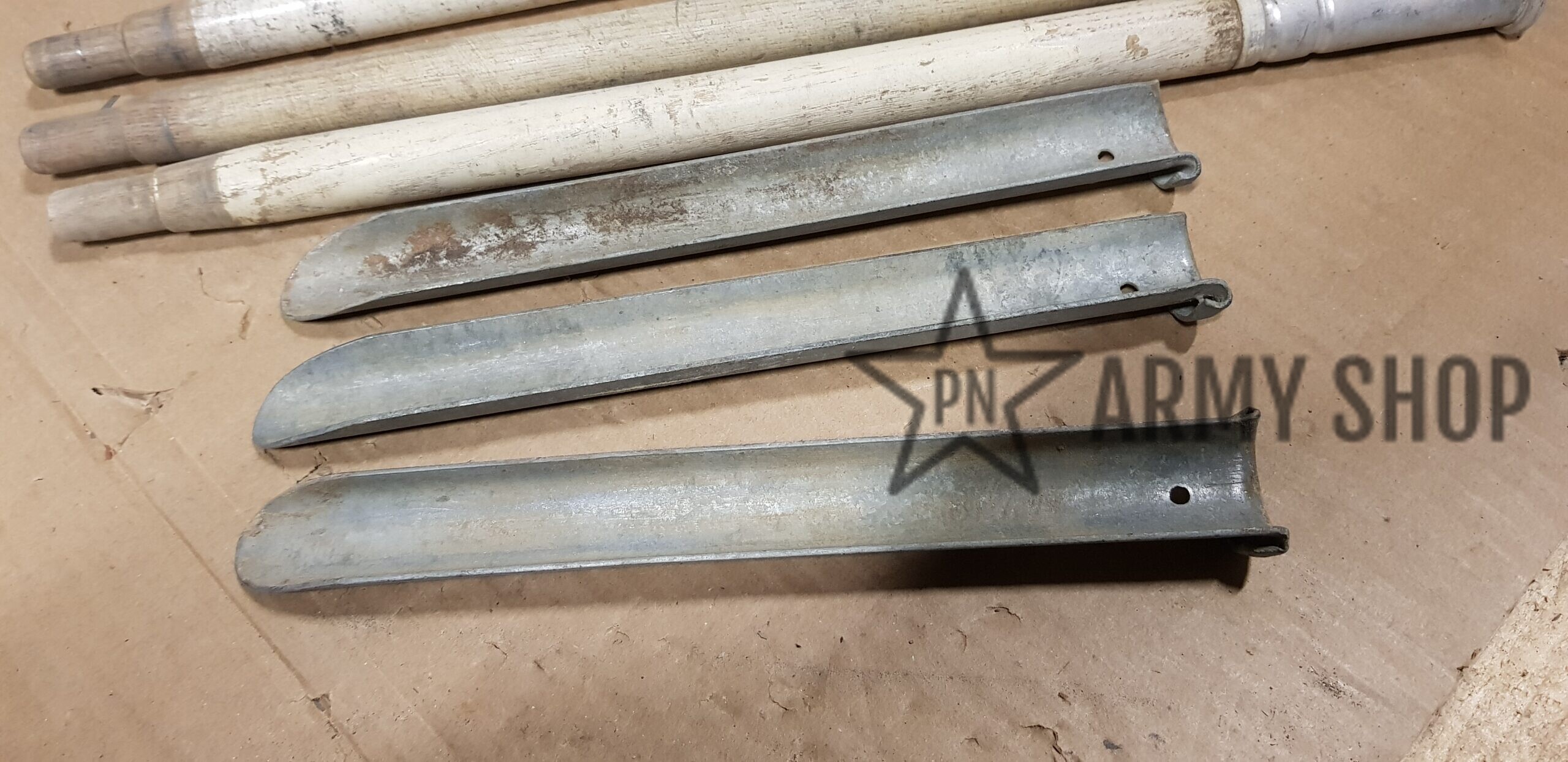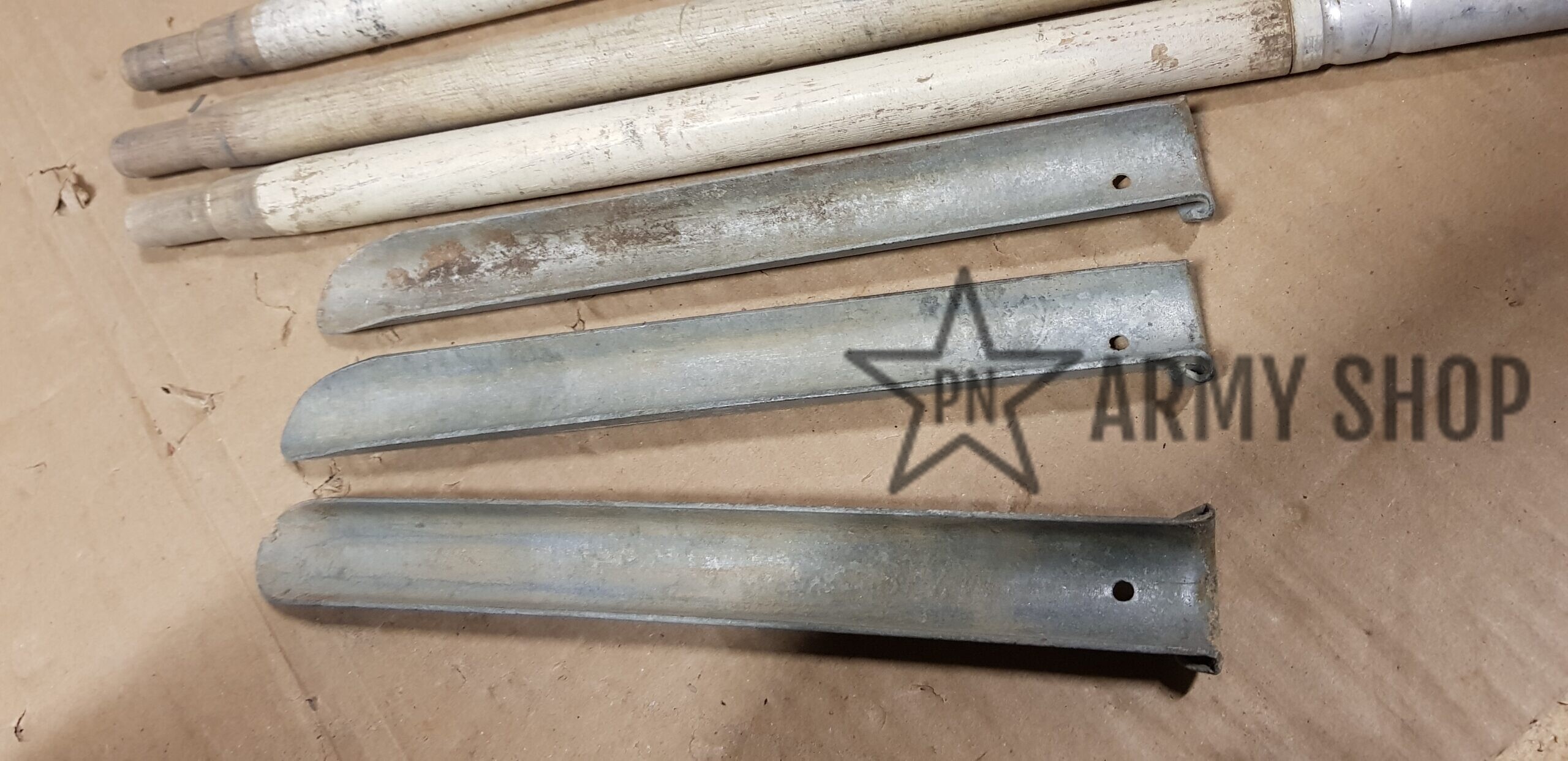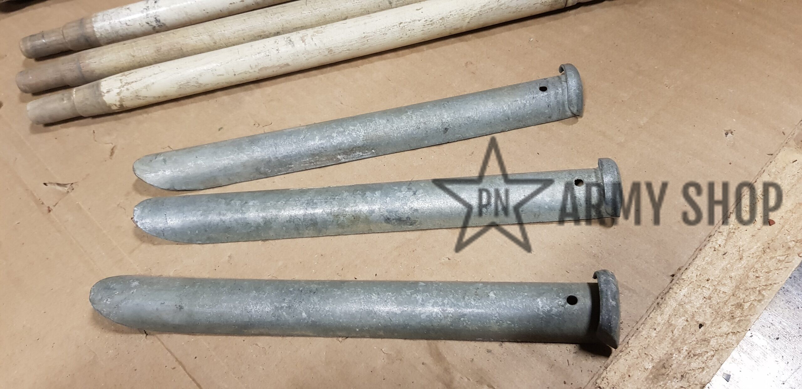sada kolíků a tyčí ke stanové celtě v pouzdru, původně německé armády, následně přejato švýcarskou armádou, která tento materiál vyřadila, orazítkováno uvnitř švýcarskými značkami, viz foto, cena za sadu, sada obsahuje pouzdro, 3x stanová tyč a  3 stanové kolíky, signováno rokem 1940 nebo 1942