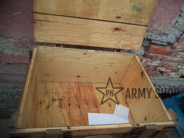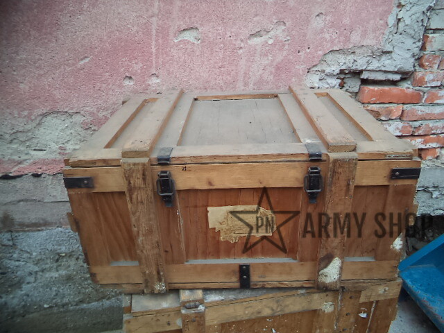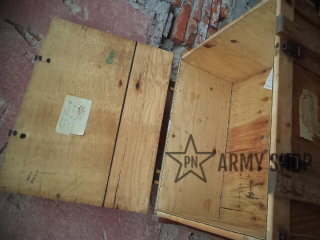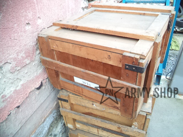 Velký transportní dřevěný box – armádní bedna, z vyřazených armádních zásob, bedny jou od materiálu – výstroje čsla – konkrétně od plynových masek OM10, JPček, filtrů apod.